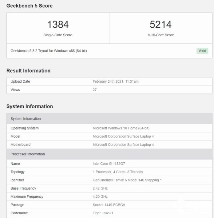 现在,新泄露的基准跑分显示了 Surface Laptop 4 的多种配置。在一个基准跑分中,这款笔记本使用的是英特尔酷睿 i5-1135G7(Tiger Lake-U)处理器,最高时钟速度为 4.40Ghz,内存为 8GB。单核跑分为 1384 ,多核跑分为 5214。