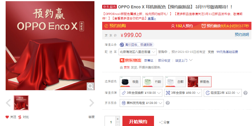 根据OPPO京东自营官方旗舰店来看,OPPO Enco X新配色将在3月11号公布,3月11号是OPPO的新品发布会,将带来新款旗舰机型OPPO Find X3系列手机。