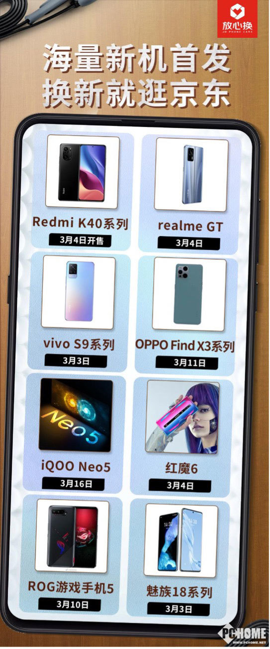 3月发布的realme GT、vivo S9、OPPO Find X3、iQOO Neo5、红魔6、ROG游戏手机5、魅族18系列等新品将在京东首发,用户购机可享30天无忧退、1小时达、先用后付、以旧换新等43项放心换服务。