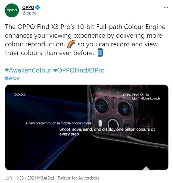 OPPO Find X3系列新品将于3月11日正式发布,OPPO官方推特已经开始了预热活动。今天,OPPO宣布,旗下新品OPPO Find X3系列首发安卓10bit全链路色彩管理系统。