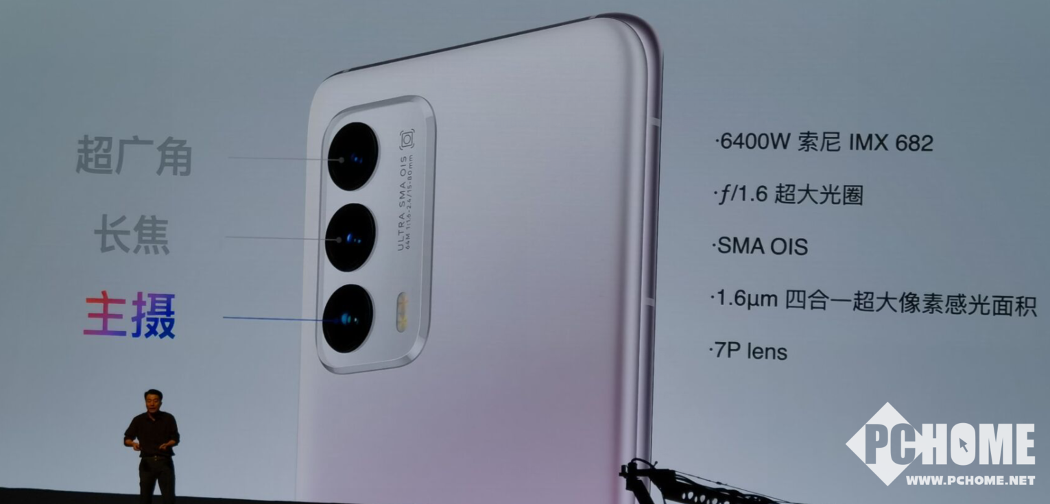 后置镜头上,魅族18后置三摄,主摄是6400万像素镜头,索尼IMX682传感器,F/1.6光圈,26mm等效焦距,广角微距镜头是1600万像素,三星S5K3P9SX传感器,等效焦距15mm,F/2.2光圈,而长焦镜头是800万像素,OV08A10传感器,等效79mm,F/2,4光圈。