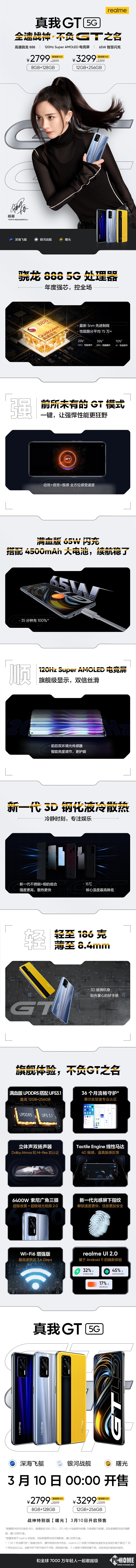 除此之外,realme GT还采用了120Hz AMOLED全面屏,后置索尼6400万AI三摄,电池容量为4500mAh,支持65W超快闪充。