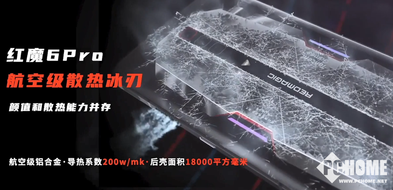 散热方面,腾讯红魔游戏手机6配备了ICE6.0 6层多维散热系统,其由包覆主控芯片的导热凝胶、起导热作用的超导铜箔、厚度仅为0.33mm的行业最薄均热板、散热面积高达3600平方毫米的石墨烯材料,内置金属峡谷风道,还有每分钟18000转的离心风扇结构。
