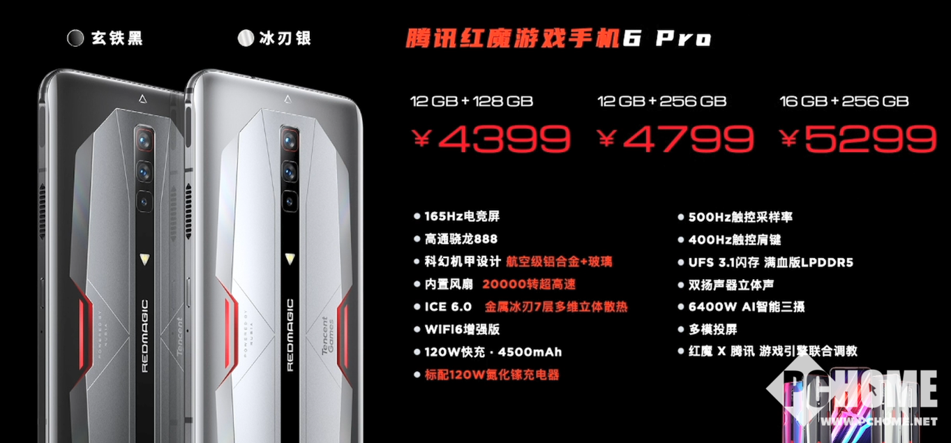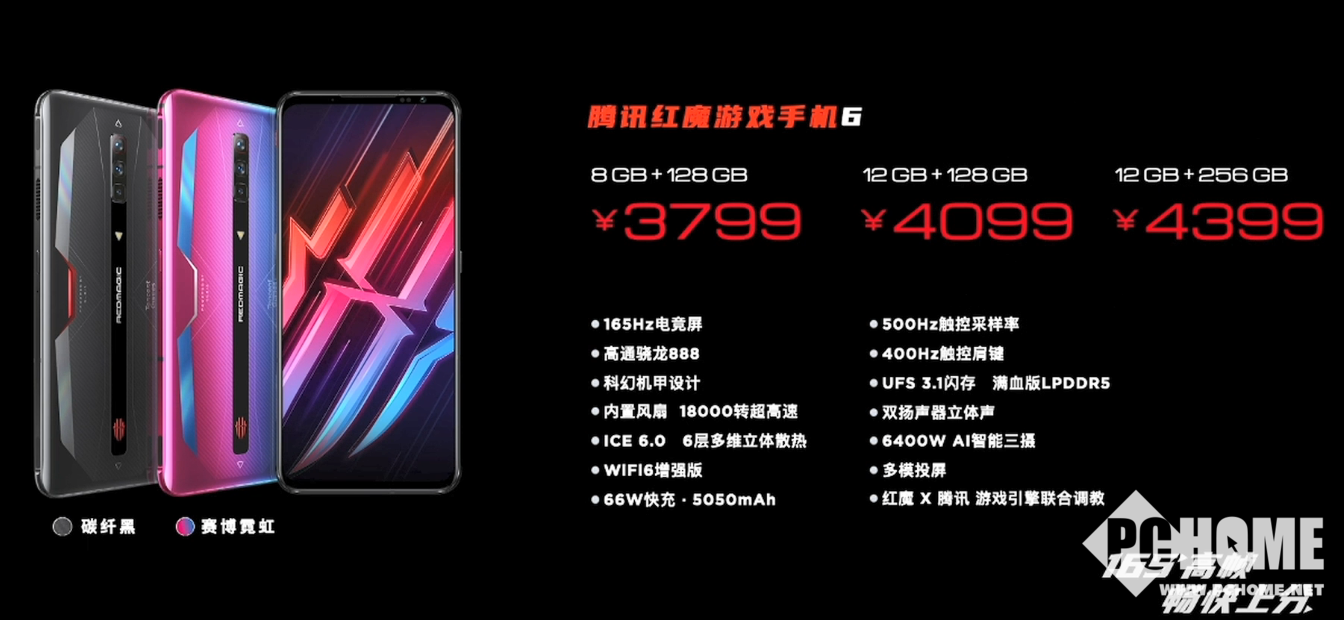 售价方面,腾讯红魔游戏手机6提供了碳纤黑与赛博霓虹两种配色,其8+128GB版本的价格为3799元,12+128GB版4099元,12+256GB版本则为4399元。而腾讯红魔游戏手机6 Pro同样也提供了玄铁黑和冰刃银两种配色,其12+128GB版本售价为4399元,12+256GB版本4799元,16+256GB版本为5299元。