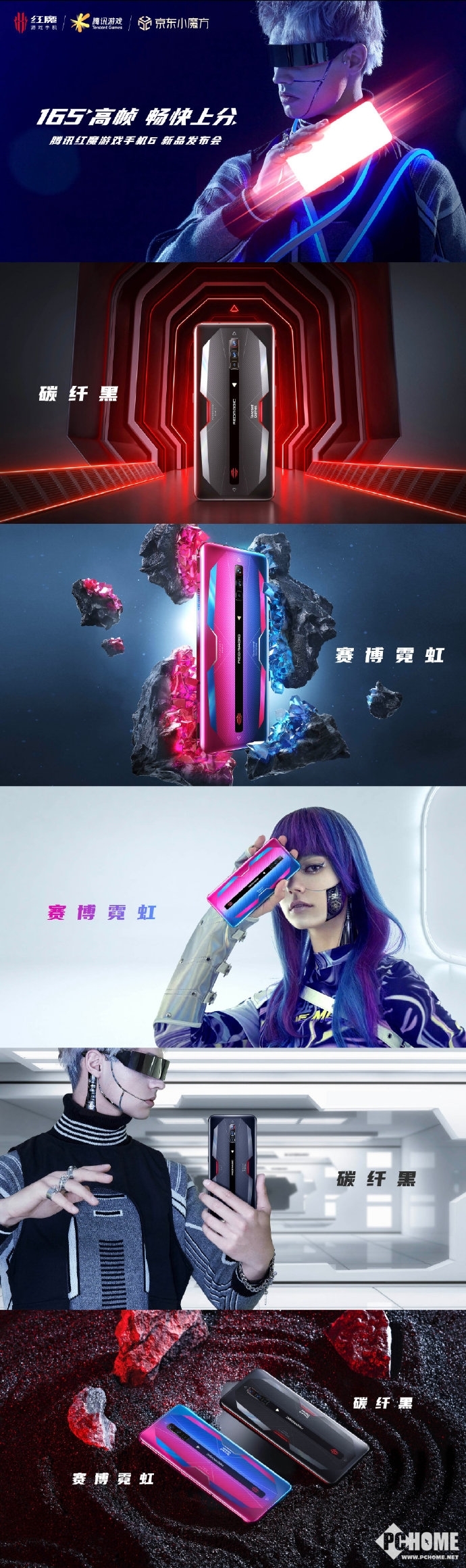 配色上,红魔游戏手机6有碳纤黑、赛博霓虹两种选择,喜欢低调奢华的可以选择前者,喜欢红蓝渐变的可以选后者。