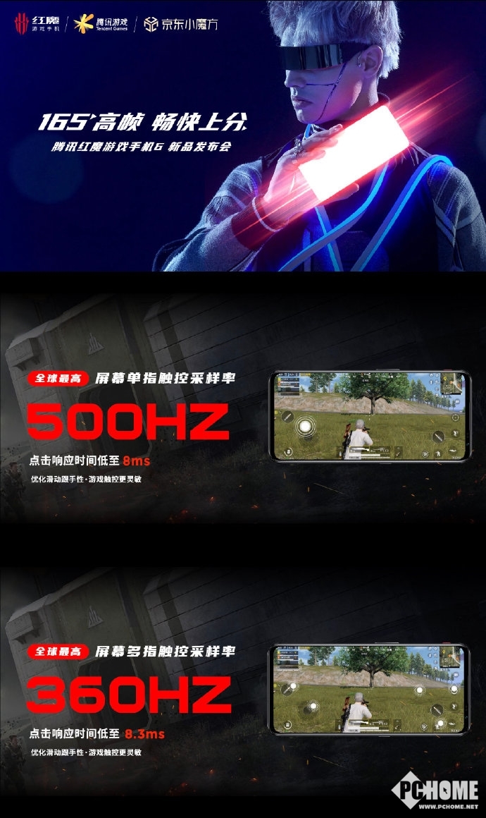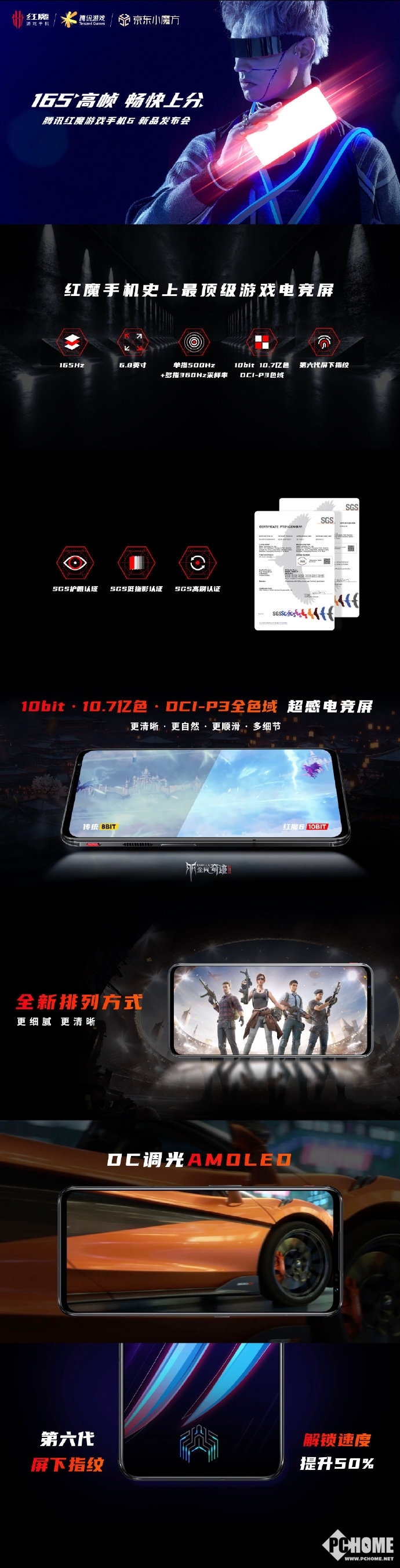 屏幕上,红魔游戏手机6配备了6.8寸AMOLED屏,分辨率2400x1080,单指触控采样率高达500Hz,多指也有360Hz,而且刷新率高达165Hz,比144Hz还要高21Hz,视觉效果更流畅,市面上适配165Hz的游戏已经超过100多款。