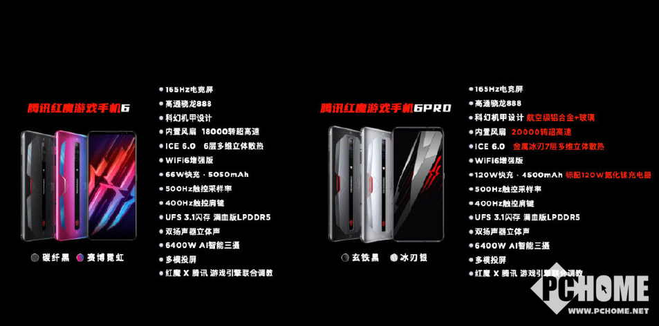 两个系列手机的配置差不多,都是骁龙888+165Hz屏,主要区别是红魔游戏手机6 Pro的外观上了航空级铝合金+玻璃,快充升级到120W,电池降到了4500mAh,散热系统进一步提升,详细配置如下。