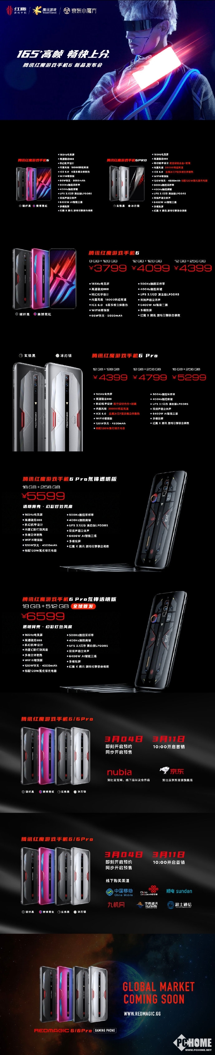 红魔游戏手机6 Pro的12+128GB版4399元,12+256GB版4799元,16+256GB版售价5299元。