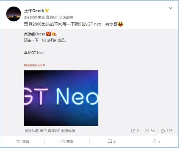 今天下午,realme全球产品线总裁王伟表示,预算2000出头的不妨等一下我们的GT neo,有惊喜。