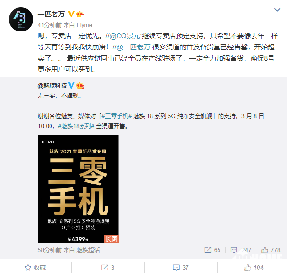 昨天魅族发布了2021年度旗舰魅族18及魅族18 Pro系列,售价4399、4999元起,3月8日正式开卖,然而今天就已经有很多渠道售罄了。