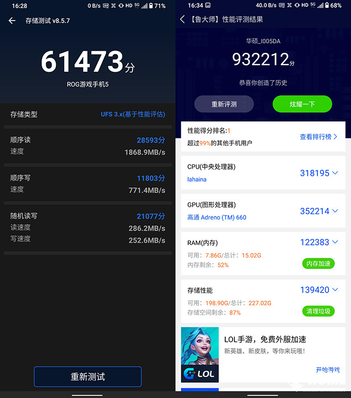 存储方面,其内置的UFS3.1存储性能也非常强悍,顺序读取速度高达1868.9MB/s,顺序写入速度可达771.4MB/s,随机读写速度都超过250MB/s。其他方面,笔者也顺手测试了一下鲁大师跑分,轻松93W击败99%的其他手机用户。