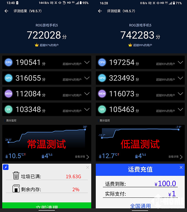通过跑分实测,在不使用任何辅助散热的情况下,腾讯ROG游戏手机5在常温模式下安兔兔可以轻松突破72W分,在低温环境下可以达到接近75W分的水平。
