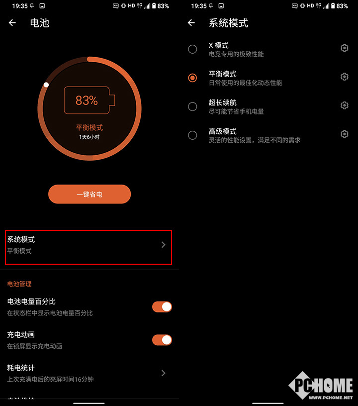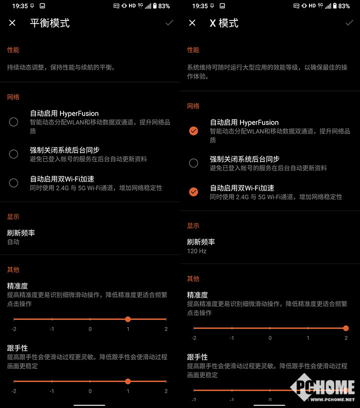 相对于复杂的设置选项,系统模式切换主要是基础性能的调整,比如网络、屏幕刷新率、跟手性等等。官方默认提供了四个选项,分别是X模式、平衡模式、超长续航模式以及高级模式。
