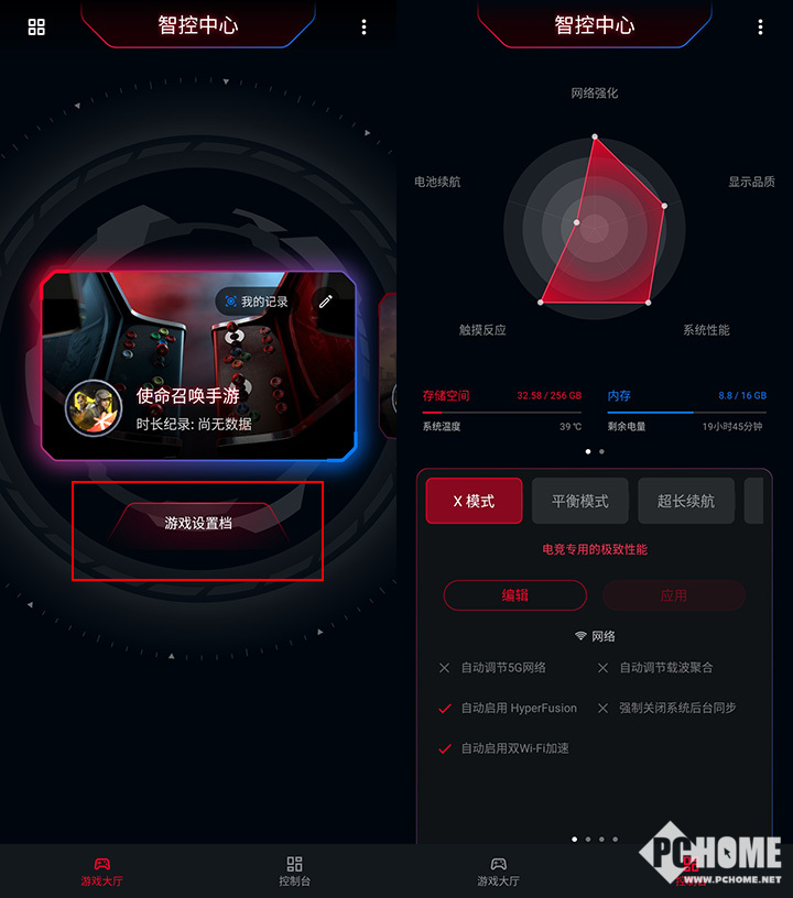 除此以外,在系统桌面的智控中心里用户也可以单独对某一款游戏进行针对性的优化调教。这套系统类似于控制台的游戏风格界面,调教的内容非常细致,包括触控、显示、性能、网络、肩键、映射键以及宏。