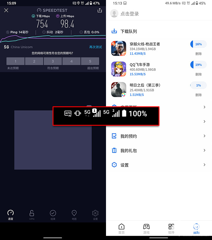 网络方面,腾讯ROG游戏手机5依靠骁龙888处理器加持,在5G网络和WiFi网络方面进一步升级。首先5G网络支持的频段非常广泛,包括国内的N28, N41, N77, N78, N79频段,此外还支持N1, N3, N7, N8, N20, N38国际频段,出国漫游也可以正常使用,并且也预先实现了5G+5G同时在线。