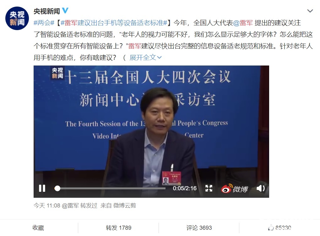 对于老年人来说,使用手机可不是个容易的事情。今日全国人大代表雷军接受了央视采访,他谈到经过疫情加速了数字经济的发展,如何抓住这一浪潮,是目前需要考虑的问题。雷军在本次人大会准备了三份提案,涉及信息技术和智能制造方面。其中就有智能设备的适老标准。
