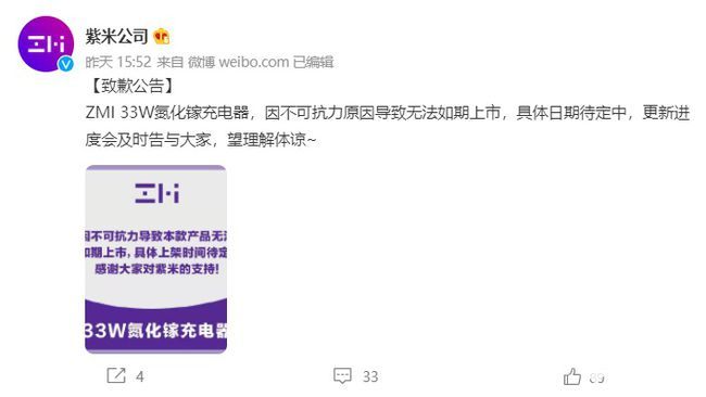 日前,紫米公司发布致歉公告,表示ZMI 33W氮化镓充电器,因不可抗力原因导致无法如期上市,具体日期待定中,更新进度会及时告与大家,望理解体谅。