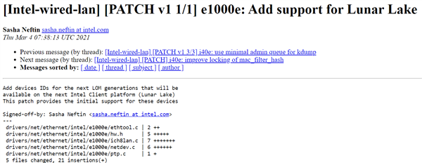 目前英特尔e1000e驱动程序中已经加入了对Lunar Lake的初步支持,而在去年1月、8月,同样是这个驱动,开始陆续支持Alder Lake、Meteor Lake。