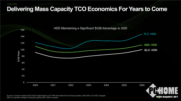 据希捷表示,至少在未来五年,SSD每GB的单价(总拥有成本)仍将是HDD的十数倍。