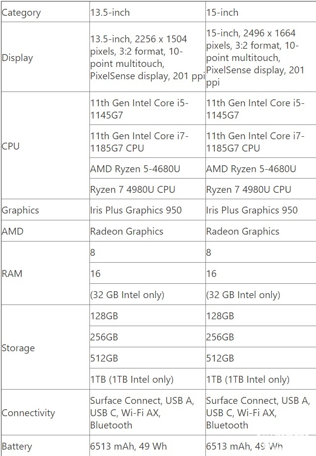 Surface Laptop 4 的英特尔版本规格有曝光,包括 Iris Plus Graphics 950,而不是 Evo Iris Xe。Surface Laptop 4 13.5 英寸和 15 英寸屏幕,配置 8GB 内存、16GB 内存、32GB 内存(仅 Intel 版)和 128GB 存储、256GB 存储、512GB 存储、1TB 存储(仅 Intel 版)。