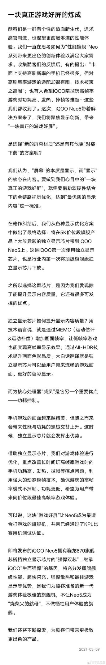 今天下午,iQOO产品线经理曾昆鹏(微博ID:手机鸟叔)发表了一篇长文,详细解释了Neo5为何要搭载独显芯片。