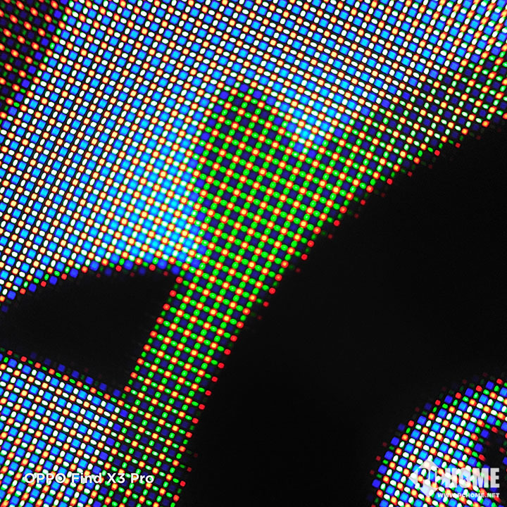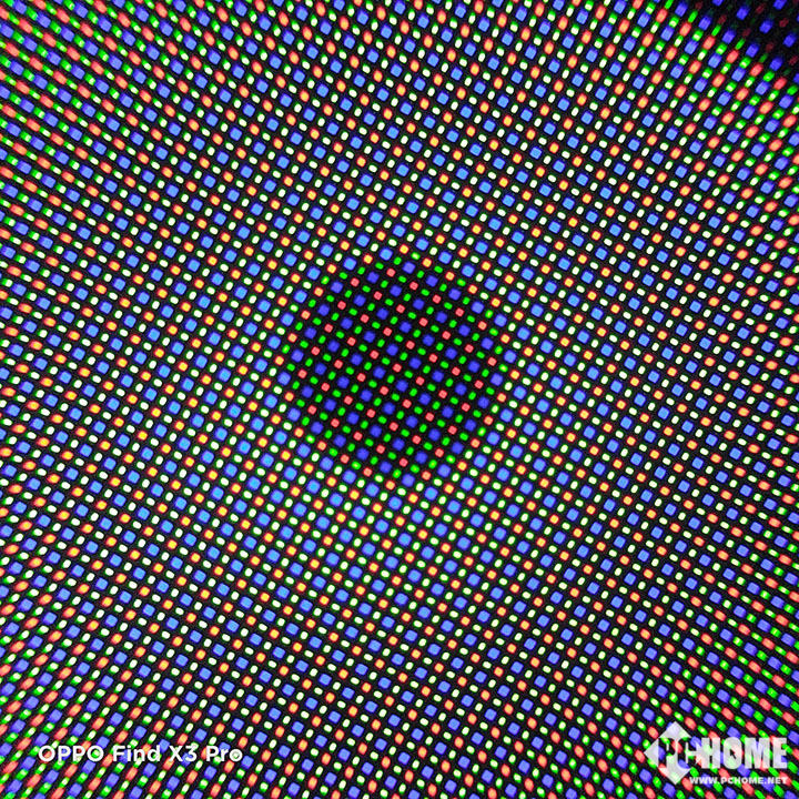 OPPO Find X3 Pro的另两颗镜头则十分有意思,其中一颗能够提供5倍混合长焦功能,最高支持20倍数码变焦效果,这颗镜头同样支持10亿色采集。最后一颗镜头则是自带环形补光灯的300万像素显微镜头,能够实现60倍的放大效果,并支持FHD视频录制功能,可以将微观世界的各种细节完美展现在我们眼前,用这个显微镜头甚至连手机屏幕面板排列都能精准还原。