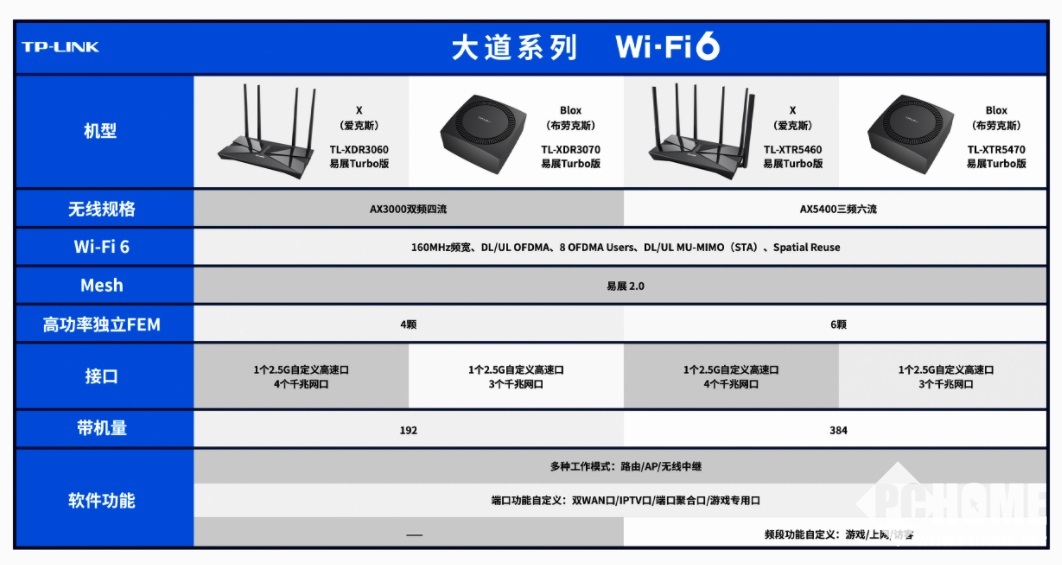 “大道”系列路由器均支持 802.11 ax Wi-Fi 6 网络,配备 1 个 2.5G 自定义高速有线网口。其中 TL-XDR3060、TL-XDR3070 两款产品采用双频四流设计,支持 160MHz 频宽,带机量可以达到 192 台。两款产均内置四颗独立放大芯片,保证了无线信号的功率。