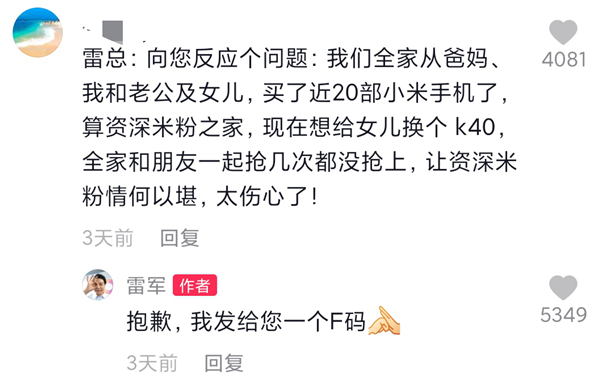 在看到这位资深米粉的“吐槽”后,雷军回复称,将赠送该米粉一个F码。