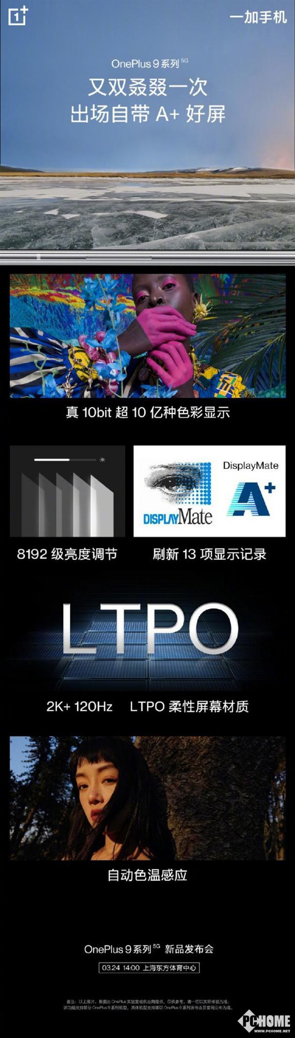 官方透露一加9获得了DisplayMate A+ 评级,刷新13了项显示纪录,拥有2K分辨率、120Hz刷新率,同时还拥有真·10bit超十亿色的显示效果、8192级亮度调节、自动色温感应等技术。