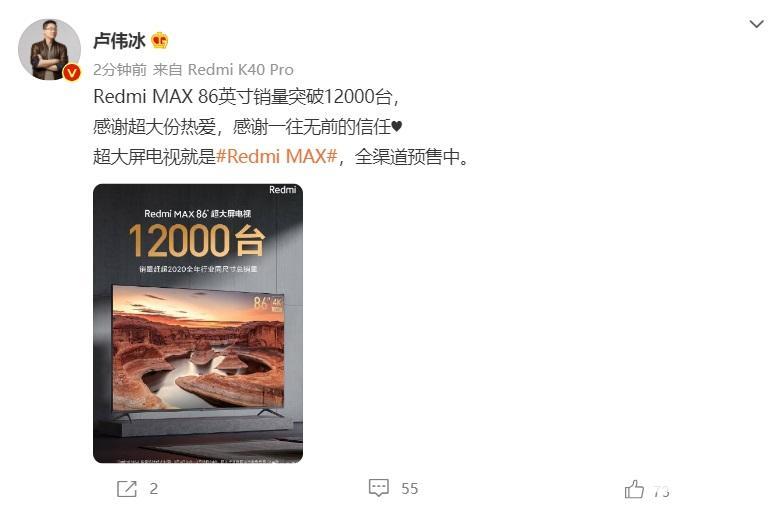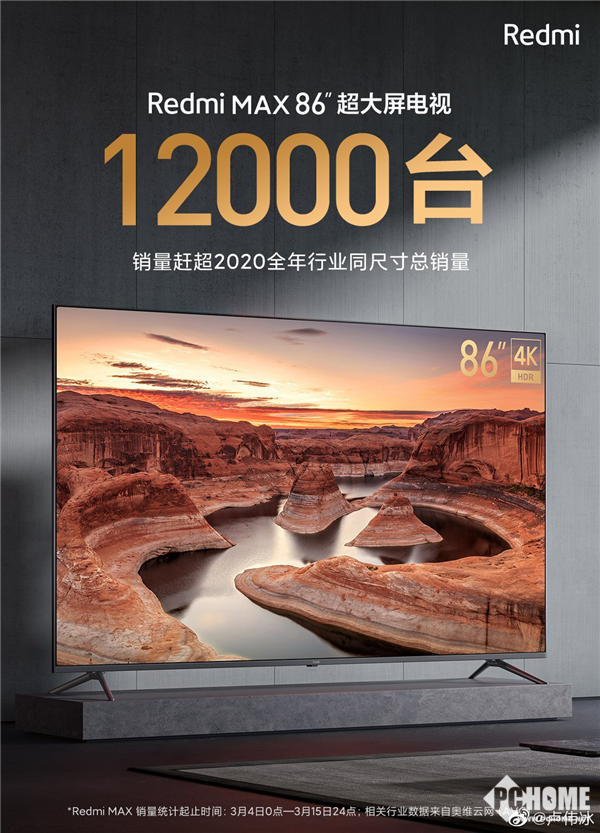Redmi MAX 86英寸超大屏电视号称是“电视带包装可进电梯的最大尺寸”,在3月4日正式发售,昨天,小米集团副总裁卢伟冰发微博宣布,Redmi MAX 86英寸销量突破12000台,仅用了12天,就可获得了如此战绩。