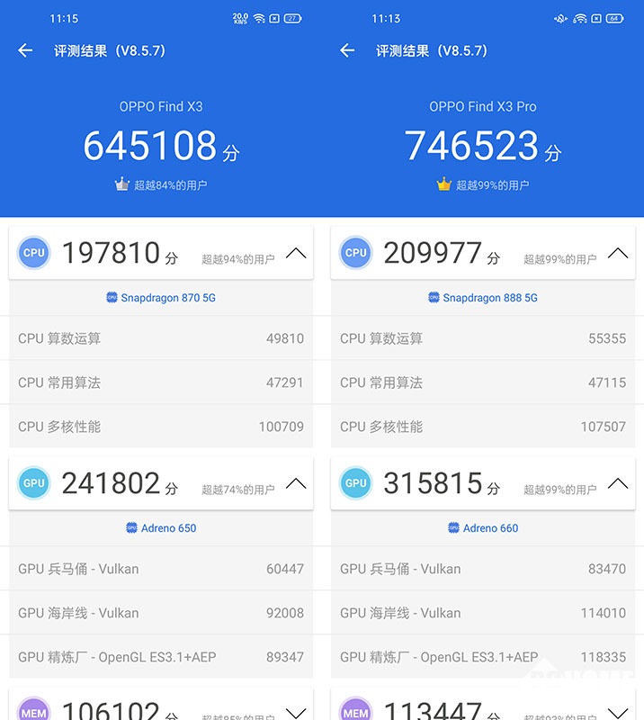 性能表现应该是OPPO Find X3与OPPO Find X3 Pro之间差距最大的地方了,在这里想要通过数字的高低来分个胜负自然可以,结论明显是OPPO Find X3 Pro更胜一筹。但正如我们前面所说,这是好与更好之间的比拼,两者均有着旗舰级别的体验,只是OPPO Find X3 Pro的体验要更为极限罢了。