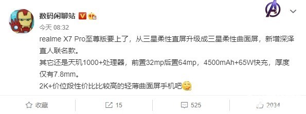 从这位博主公布的信息中可以了解到,realme X7 Pro至尊版的显示屏是三星柔性曲面屏,而此前的版本是三星柔性直屏,这说明该机采用了曲面屏设计,滑屏体验将是全新的。另外,这款手机搭载了天玑1000+处理器,前置相机是3200万像素,后置主摄是6400万像素,内置4500mAh容量电池,厚度仅有7.8mm。该博主还点评了这款新手机,2千多价位段性价比比较高的轻薄曲面屏手机。