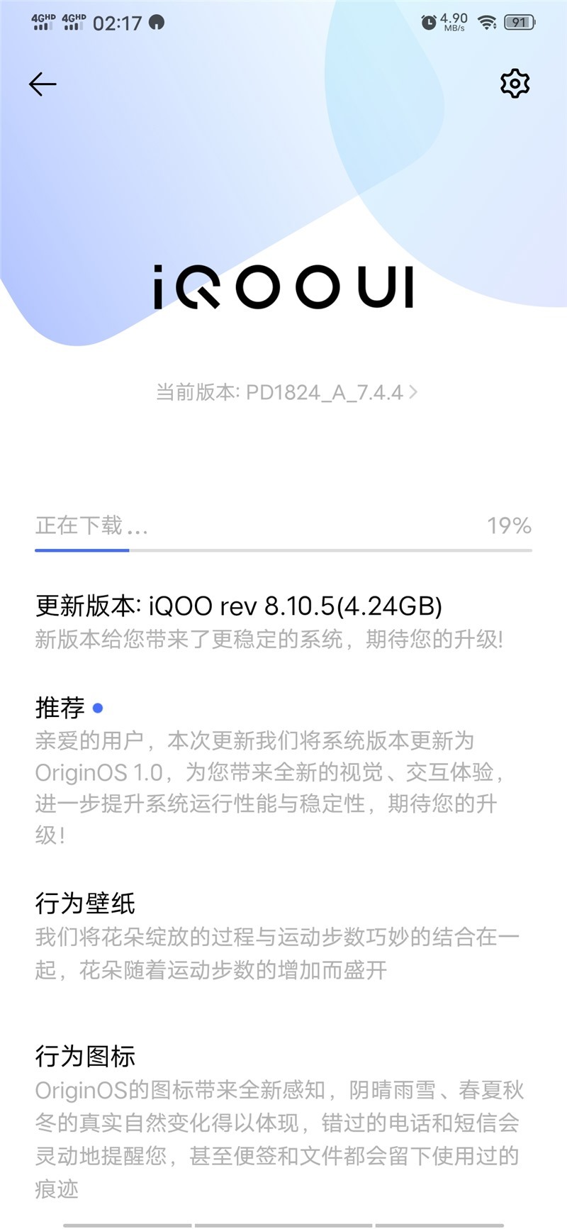 iQOO一代手机获得了OriginOS 1.0系统升级的推送,本次更新大小为4.24G,新增了行为壁纸、行为图标等功能,相比此前系统进行了大量优化。