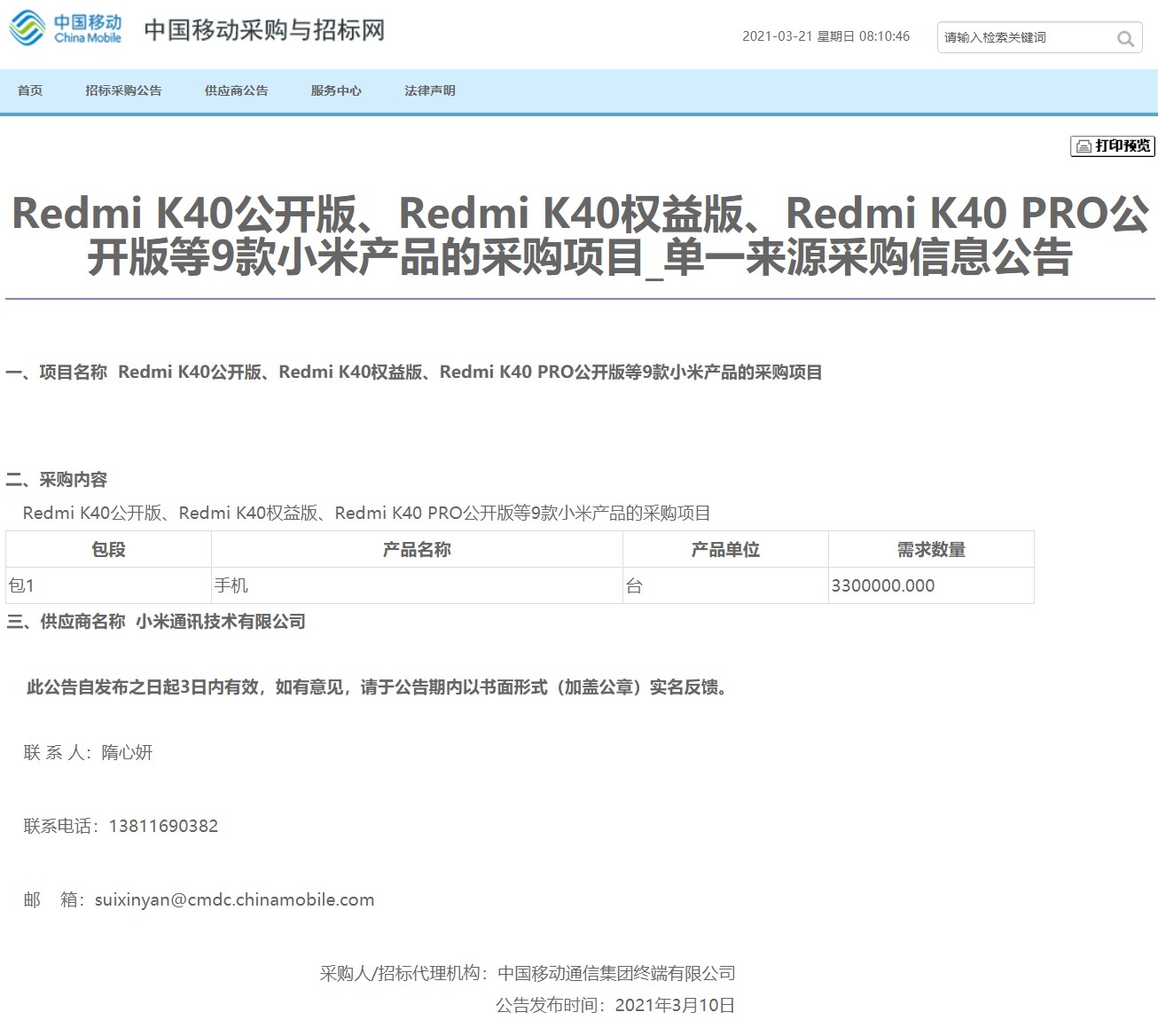 根据中国移动采购与招标网发布了信息,中国移动通信集团终端有限公司面向小米公司进行了Redmi K40公开版、Redmi K40权益版、Redmi K40 Pro公开版等9款小米产品的采购。