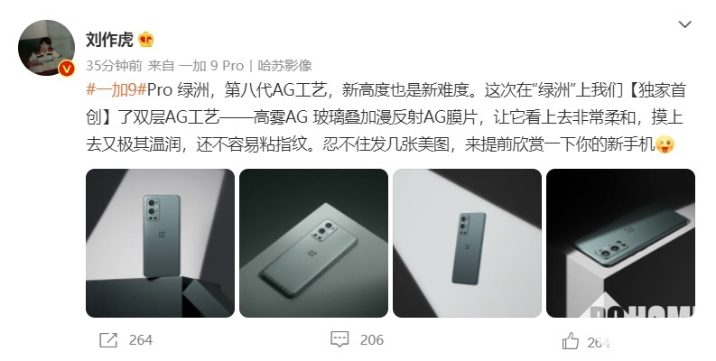 一加CEO刘作虎晒出了一加9 Pro绿洲配色。该配色采用了第八代AG工艺,也是独家首创的双层AG工艺,采用高雾AG玻璃叠加漫反射AG膜片,不易沾染指纹。