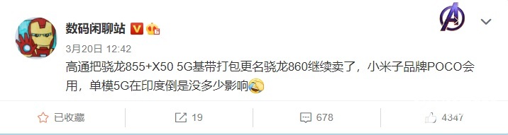 爆料称小米POCO X3 Pro将搭载高通骁龙骁龙860处理器。这款芯片官方还未正式公布,根据@数码闲聊站消息,860就是通把骁龙855+X50 5G基带打包更名继续卖了。