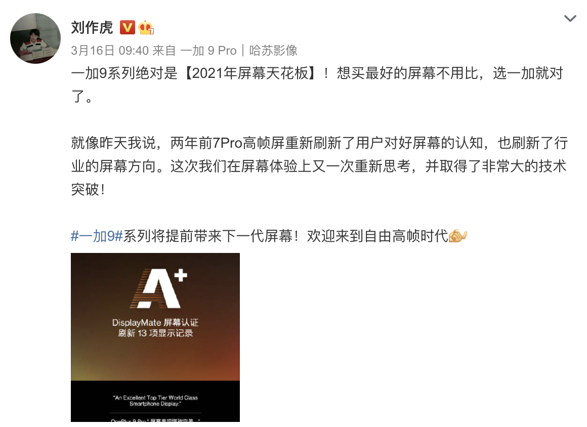一加9系列手机未发先火,主要归功于屏幕的亮点上,该机所采用的屏幕素质顶级,具备“获得DisplayMate A+ 评级,刷新13项显示纪录,拥有2K分辨率、120Hz刷新率,同时还拥有真10bit的色彩显示、8192级的亮度调节、自动色温感应等技术”等功能点。据悉,一加9系列采用最新AMOLED背板材料LTPO,并突破性地实现 1Hz-120Hz的刷新率之间切换,既能获得高刷的畅快感,还能降低高帧屏显示功耗。一加创始人刘作虎称一加9系列绝对是2021年屏幕天花板!