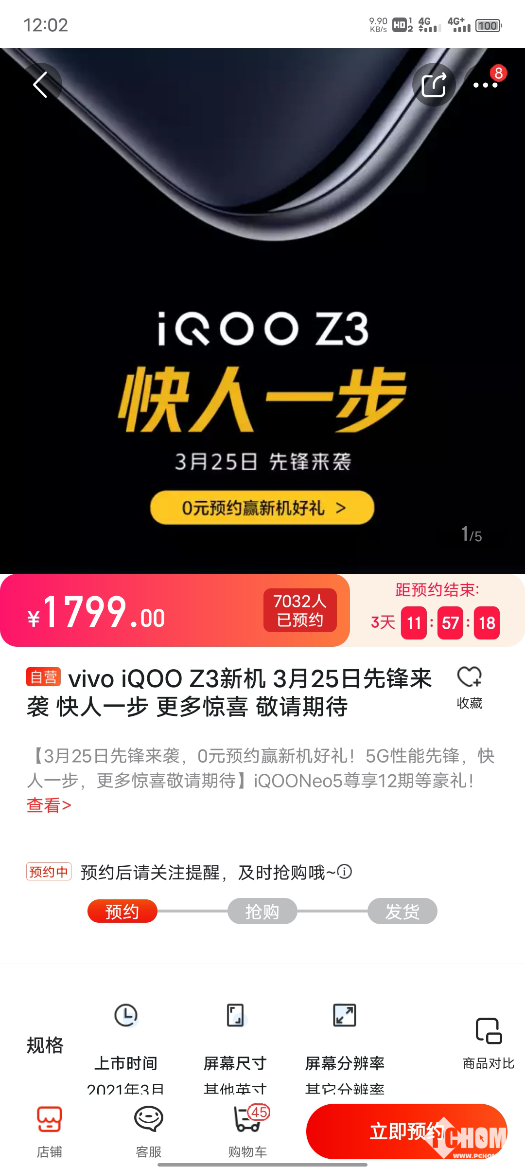 【PChome手机频道资讯报道】iQOO Z3即将在本周发布,今天又有网友放出了该机在电商平台的预约界面截图,其中显示该机售价为1799元起,如果这个售价属实的话,那么iQOO Z3毫无疑问将是千元档之中最值得选择的5G新机之一了。