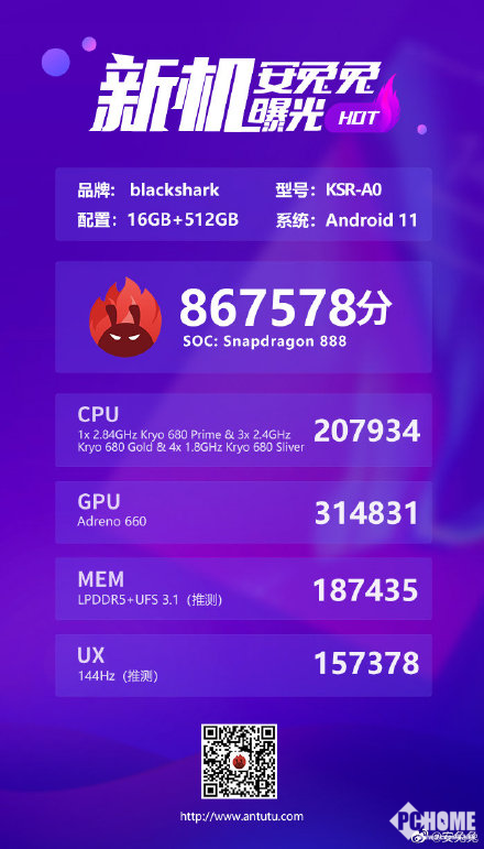 黑鲨4的新品发布会将于下午3点举行,而就在刚才安兔兔发博表示,一款型号为“KSR-A0”的黑鲨新机跑分突破86万,黑鲨官方也转发了该微博,暗示该机正是黑鲨4 Pro。
