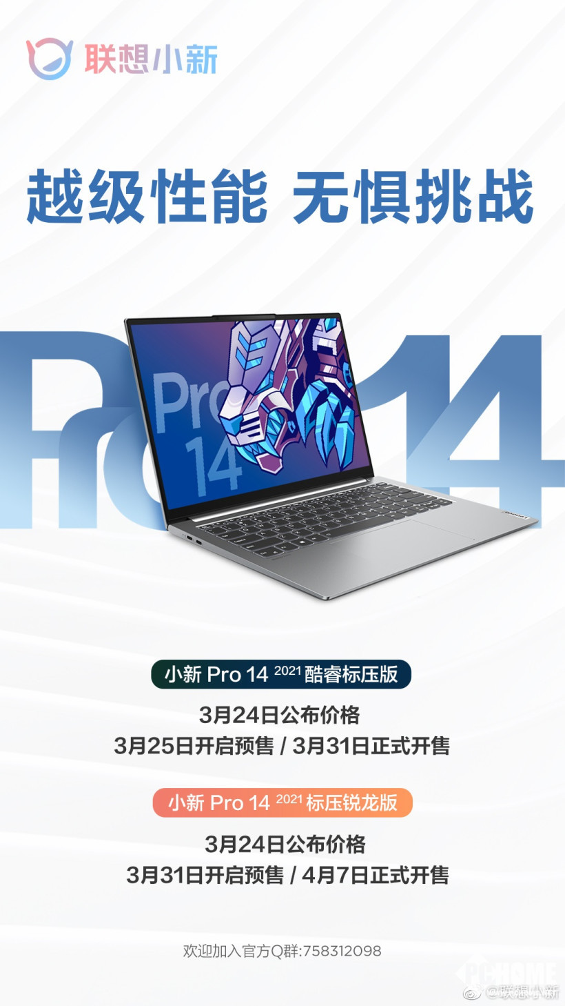 联想小新官方最近正式宣布,将于3月24日公布联想小新Pro 14 2021的价格。Intel Tiger Lake-H35版将在3月25日开启预售,3月31日正式开售;AMD锐龙标压版3月31日开启预售,4 月7日正式开售。