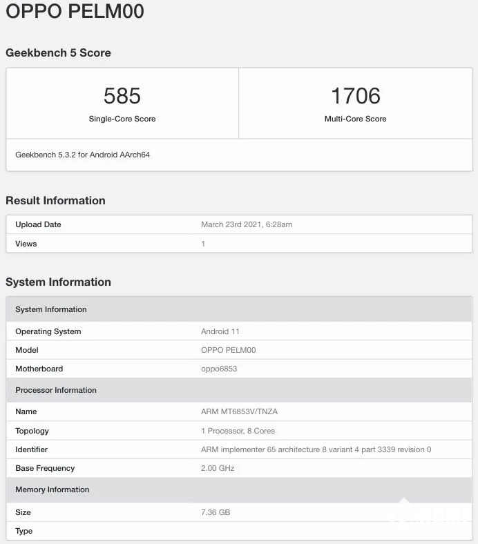在Geekbench列表中指出,OPPO PELM00智能手机由Dimensity 800U芯片组供电,该芯片组被称为MT6853V / TNZA。该清单进一步指出,该设备具有8 GB的RAM和Android 11 OS。该手机在Geekbench的单核和多核测试中分别得分585和1706。