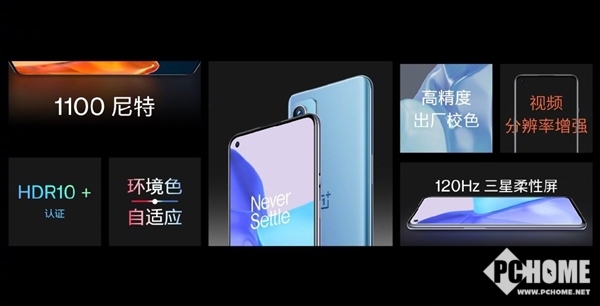 同时,一加9还支持120Hz刷新率、出厂逐一色彩校准、HDR10+认证、前后双光感和8192级自动亮度调节。
