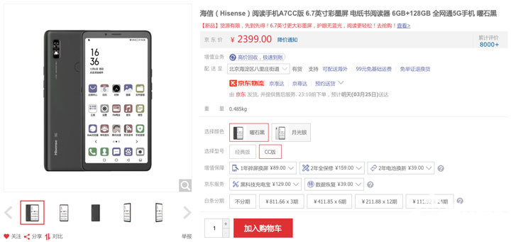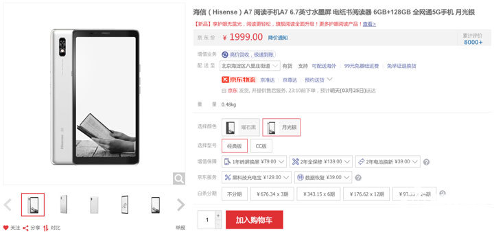 海信5G阅读手机经典版与CC版均在电商平台火热发售,共有曜石黑和月光银两种配色,内存6+128GB,经典版售价1999元,CC版售价2399元。用户购机可享最高24期分期。