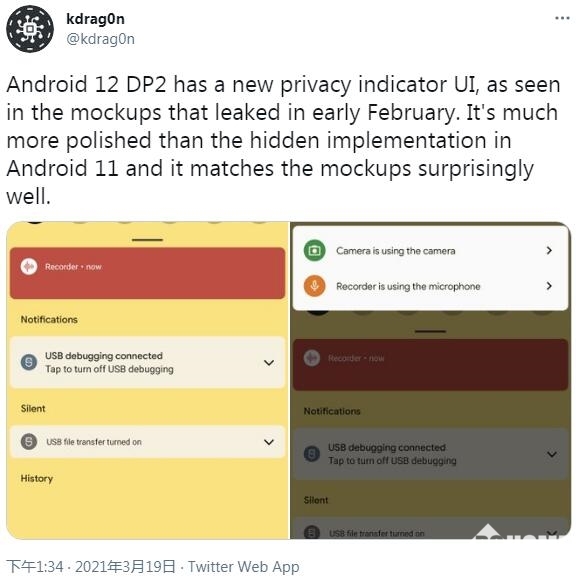 从开发者分享的截图看,Android 12新版中会告知哪款App有调用相机或麦克风权限,以便用户确定是否正在被特定的App监听。