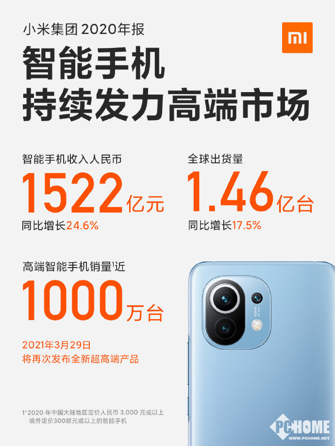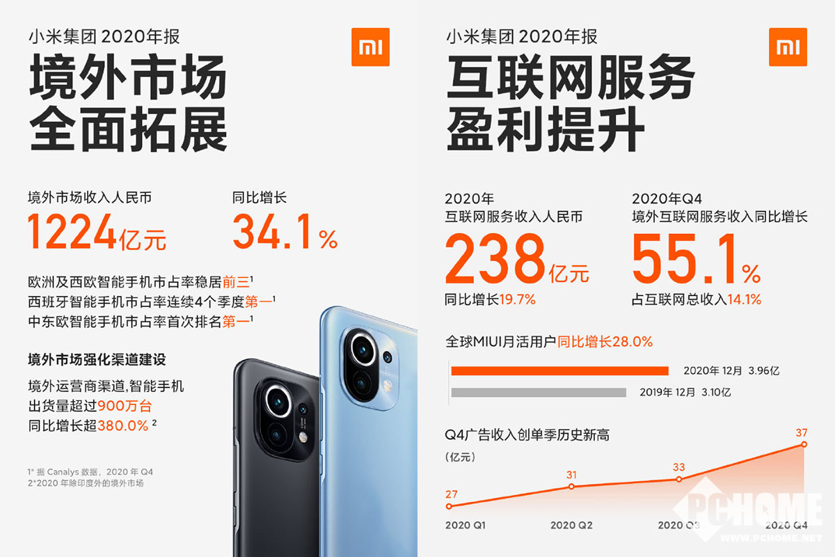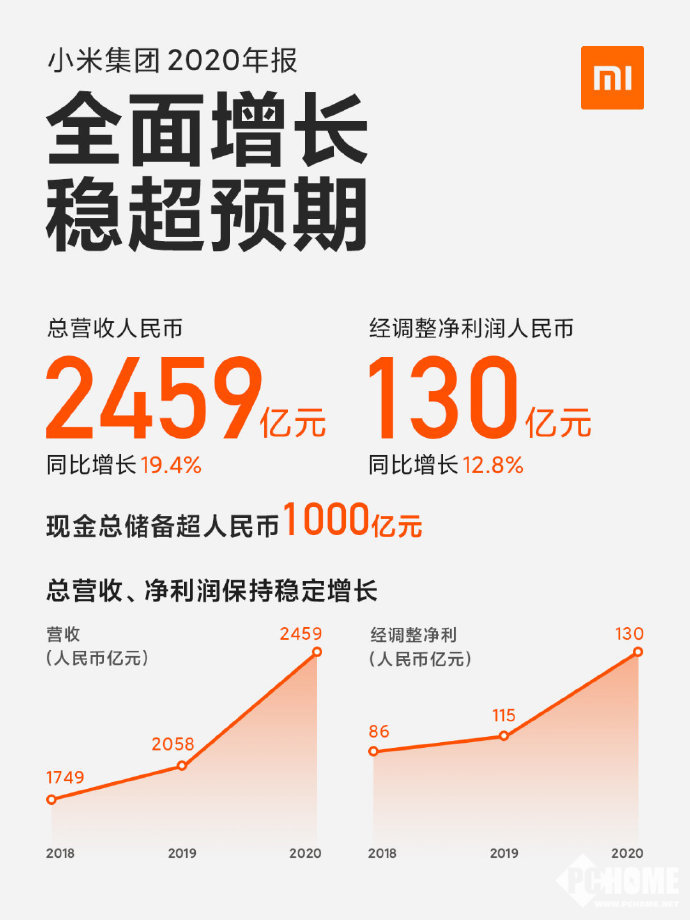 【PChome手机频道资讯报道】小米在今天发布了2020年度财报,从财报数据上来看,小米在2020年的表现非常不错,所有主要业务均出现了较大幅度的增长,整体收入和利润也在稳步提升,同时小米拥有超过1000亿元的总现金储备,整体发展态势十分优秀。