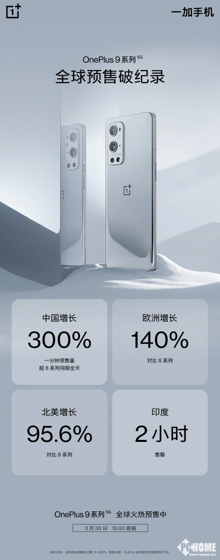 不仅如此,对比一加8系列,一加9在欧洲预售量更是增长140%,北美增长95.6%,在印度市场更是2小时全部售罄。