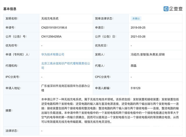 近日,华为技术有限公司公开 “无线充电系统”专利,公开号为 CN112564295A,企查查专利摘要显示,本申请公开了一种无线充电系统,属于无线充电技术领域。本申请中两个发射电极中的一个发射电极和两个接收电极中的一个接收电极通过电导率大于空气的电导率的第一传输介质耦合,因而可以提高这一个发射电极与这一个接收电极间的等效耦合电容,从而可以有效提高无线充电传输距离,增强无线充电灵活性。