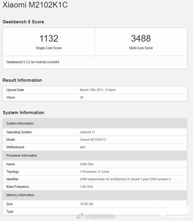 小米即将发布顶级高端旗舰小米11 Ultra,有数码博主曝光了该机的Geekbench跑分数据。这款手机搭载骁龙888芯片,同时还拥有12GB运存,单核得分为1132,多核得分为3488,预装Android 11系统。