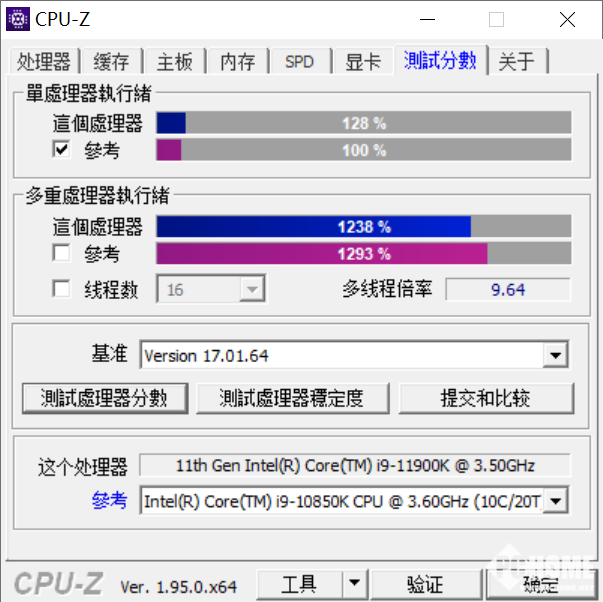 基准性能方面,我们将使用多款软件来进行衡量。首先我们通过CPU-Z(版本V1.95)自带的性能测试进行简单的横向评估。