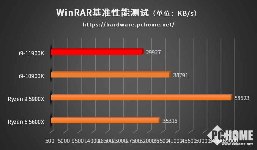 WinRAR是一款常用的文件压缩、解压工具,其内置的基准性能测试与平台的CPU、内存和硬盘都有关系,处理器是影响压缩文件速率的直接因素。因此我们也可以用这一软件来表现处理器的性能。在WinRAR 5.80 X64版本的基准性能(开启多线程)测试中,i9-11900K的处理速度为29927KB/s。作为参考,i9-10900K的成绩为38791KB/s,Ryzen 9 5900X的成绩为58623 KB/s,Ryzen 5 5600X的成绩为35316 KB/s。